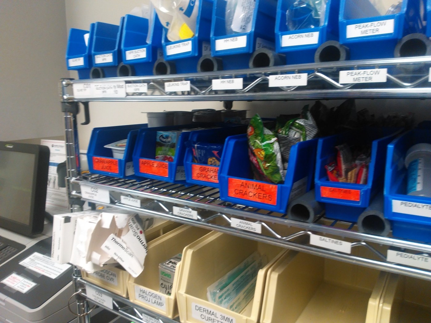 Kanban is an inventory management system often used in lean production and manufacturing. There are two bins of each item; when one bin is empty, the second is pulled forward. In the picture above, you can see the blue bins. Empty bins go to the central supply office and the bar codes are scanned to generate a new order. For larger items, a card is used. There is more to this than just bins. You need to truly understand every item in your supply chain. What is coming in and how much is going out. You use this knowledge to load your bins. Each bin is calculated by usage rate and how long it takes your supplier to resupply.